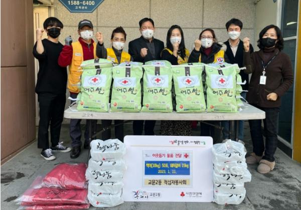 [한국뉴스타임=편집국] 구리시 교문2동 행정복지센터는 11일 교문2동 적십자봉사회로부터 민족 최대 명절인 설 명절을 맞아 관내 차상위계층 주민을 위한 백미 50포 및 갈비 15kg를 전달받았다.