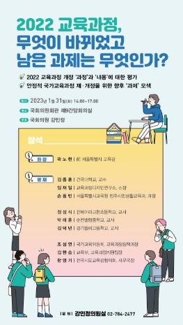 1월 31일 14시부터 국회의원회관 제9간담회의실에서 진행될 ‘2022 교육과정, 무엇이 바뀌었고 남은 과제는 무엇인가?’ 토론회는 작년 말 확정, 고시된 2022 교육과정의 개정 과정과 내용을 전문연구자, 교사, 교육기관 담당자들이 종합적으로 평가하고 향후 과제를 모색하는 자리이다. 이 토론회는 강민정 의원실에서 2020년부터 계속해 오고 있는 2022 교육과정 관련 연속토론회의 여덟 번째 토론회이다.