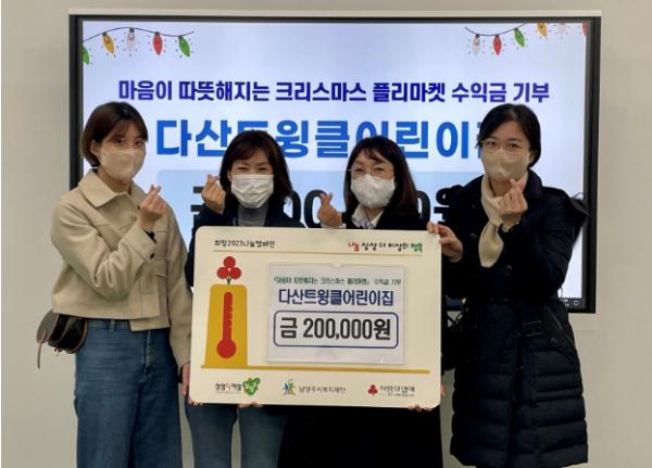 [한국뉴스타임=편집국] 남양주시 다산트윙클어린이집은 지난 10일 지역 내 어려운 이웃을 돕기 위해 플리마켓 수익금 20만 원을 남양주시복지재단에 전달했다.