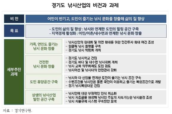 경기연구원은 경기도 낚시산업 발전 방향과 세부추진과제로 ▲가족과 연인도 즐기는 낚시 문화 창출, 시설현대화를 위한 수변공간의 임대기간 연장 등 투자 제약요인 개선, 민간투자 확대 여건 조성, 낚시 서비스 공급자와 수요자 간 원클릭 낚시 플랫폼 구축과 낚시 문화 창조 및 낚시산업의 발전을 촉진하는 낚시 박람회 개최 ▲어족자원 및 수자원을 보호하고 안전사고 발생을 최소화하는 건전한 낚시 문화 창출, ‘낚시 교육 의무화 제도(안)’ 도입, 낚시어선 및 낚시터의 안전관리 강화 ▲낚시터 도민의 휴양공간으로 개발, 융복합형 낚시 문화 창출을 선도하는 시설 및 공간 구축, 수변공간 낚시터-산책로-오토캠핑-글램핑이 어우러진 복합공간으로 개발, 경기도 해양수산부 낚시 복합타운 건립 사업 적극 유치 ▲상생의 낚시산업 발전 공간 구축, 낚시 어획량 제한, 오염 유발 낚시도구 사용 최소화 등을 제시했다.