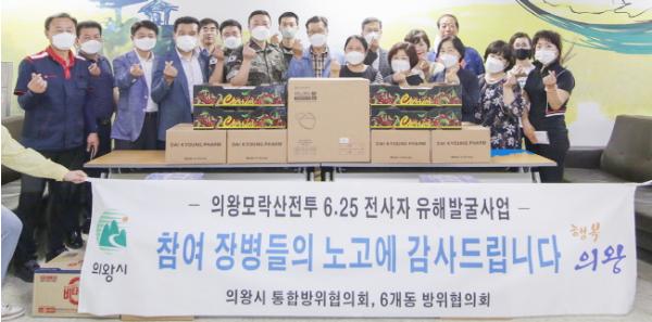 [KNT한국뉴스타임] 의왕시 통합방위협의회와 6개동 방위협의회 회장단은 지난 10일 의왕시 여성회관을 찾아 인근 모락산에서 ‘의왕 모락산전투 6.25 전사자 유해발굴사업’을 벌이고 있는 육군 51사단 장병들에게 방역용 마스크 1,200매, 손소독제 200병, 샌드위치와 음료수 등 위문품을 전달하고 노고를 격려했다.