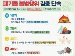 경기도 특사경은 이번 폐기물 불법행위 연중 단속을 예년과 다르게 계절별 폐기물 불법행위 특성을 감안한 분기별 맞춤 단속으로 집중도를 높일 계획이다. 이에 따라 분기별로 ▲(1분기) 겨울철에 많이 자행되는 불법소각, 농지 객토를 빙자한 각종 폐기물 불법 성토·매립 ▲(2분기) 봄철 건설공사 증가에 따른 건설폐기물 불법 처리 ▲(3분기) 여름철 닭 소비량 증가에 따른 동물성 잔재물 부적정 처리 ▲(4분기) 고물상과 재활용업체 폐기물 무단 방치 등을 각각 집중 단속한다.