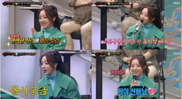 케이는 5일 방송된 MBC '미스터리 음악쇼 복면가왕'(이하 '복면가왕')에 연예인 판정단으로 출연했다.
