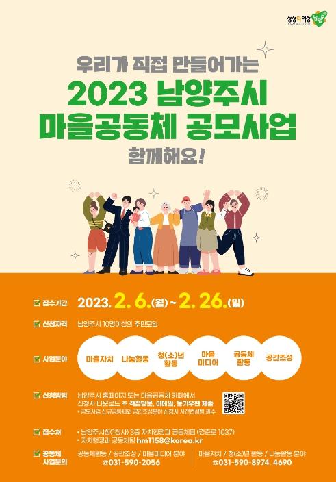 [한국뉴스타임=편집국] 남양주시는 주민 스스로 지역 문제를 해결하고, 마을 발전과 삶의 질 향상을 위한 공동체 활동을 지원하고자 ‘2023년 마을공동체 공모 사업’을 추진한다.