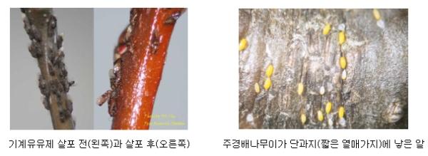 다만, 언 피해가 자주 발생하는 과수원에서는 기계유유제 대신 주경배나무이 적용 약제를 권장 농도에 맞게 희석한 뒤 뿌려준다.