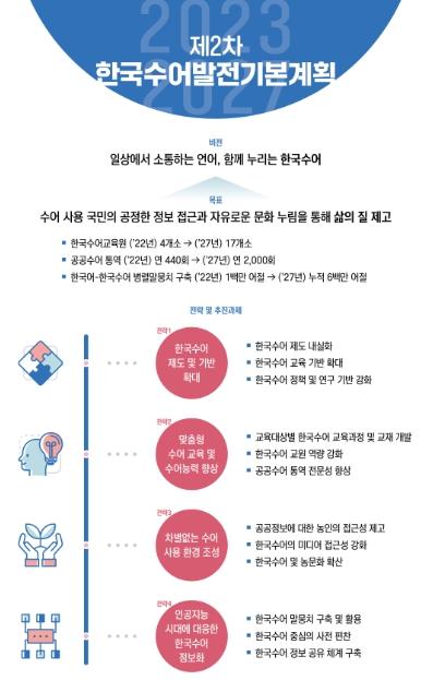 농인은 청각장애인 중 수어를 일상어로 사용하는 사람으로서 국내에 약 5만 2천여 명이 있는 것으로 추정된다. 농인들은 수어를 통해 사고하고, 정보에 접근하고, 문화를 누리고, 사회와 소통한다. 이에 윤석열 정부는 ‘공정한 문화 접근 보장’을 국정과제로 지정해 농인의 언어권과 정보 접근권을 강화하고 있다. 이를 달성하기 위해 제2차 기본계획은 ‘일상에서 소통하는 언어, 함께 누리는 한국수어’라는 비전 아래, ▲ 공정한 한국수어 교육, ▲ 차별 없는 정보 접근, ▲ 자유로운 문화 누림 등 공정하고 자유로운 한국수어 사용 환경 조성을 통한 삶의 질 제고 등을 목표로 4가지 추진 전략과 12가지 추진 과제를 선정했다.