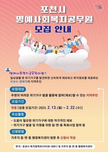 [한국뉴스타임=편집국] 포천시는 2월 13일부터 22일까지 10일간 위기이웃 발굴과 지원 활동에 참여할 명예사회복지공무원을 집중 모집한다.
