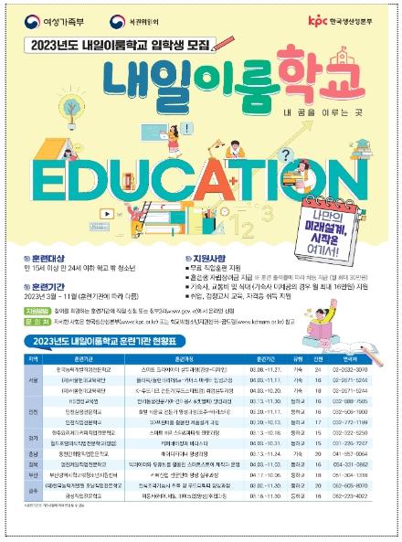 [한국뉴스타임=편집국] 여성가족부는 만 15세부터 만 24세 이하 학교 밖 청소년들의자존감을 높이고 자립역량을 키울 수 있도록 직업훈련을 제공하는 2023년도 내일이룸학교 훈련생 227명을 모집한다.