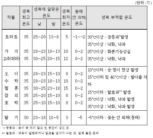 또한, 시설에서 재배하는 작물의 생육 부적합 온도를 반드시 파악하고, 갑작스럽게 생장이 멈추는 순멎이 현상이 발생하지 않도록 관리한다. 수박, 멜론 등은 12도(℃) 이하, 오이는 10도(℃) 이하, 딸기는 3도(℃) 이하로 내려가지 않도록 내부 온도를 유지한다.