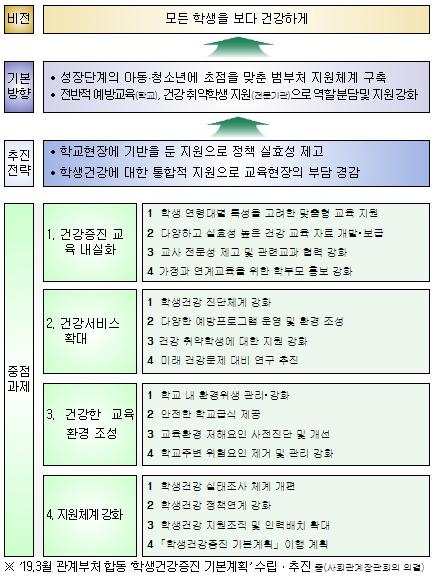 '학교보건법'개정(2021.9.24.)에 따라, 교육부장관은 5년마다 ‘학생건강증진 기본계획’을 수립·시행해야 하며, 교육감과 협의하여 학생건강증진 전문기관을 설립하거나 지정할 수 있다.