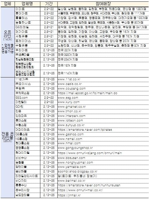 이번 행사에는 이마트, 롯데마트, 홈플러스, 지에스(GS) 리테일, 수협바다마트, 농협하나로마트, 우리마트 등 14개 오프라인 업체와 우체국쇼핑, 마켓컬리, 쿠팡, 수협쇼핑 등 26개 온라인 쇼핑몰이 참여한다. 해양수산부는 1인당 1만 원 한도로 20% 할인을 지원하며, 참여 업체의 자체 할인을 추가해 소비자들은 최대 50%까지 할인된 가격에 수산물을 구매할 수 있다. 할인행사 참여 매장 등 그 밖에 자세한 내용은 행사 공식 누리집에서 확인하면 된다.