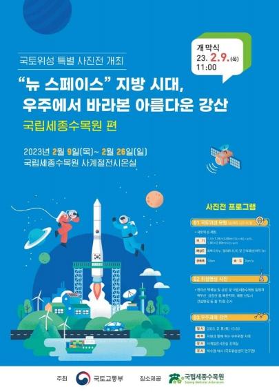 이번 국토위성영상 사진전은 국립세종수목원에서 개최중인 ‘나의 초록 우주’ 특별전과 연계하여 그간 국토위성 1호가 촬영한 국내 명산 등 총 15점의 작품과 국토위성 모형이 상설 전시(09:00~17:00, 매주 월요일 휴관)되며, 국립세종수목원 사계절전시온실에서 관람이 가능하다.