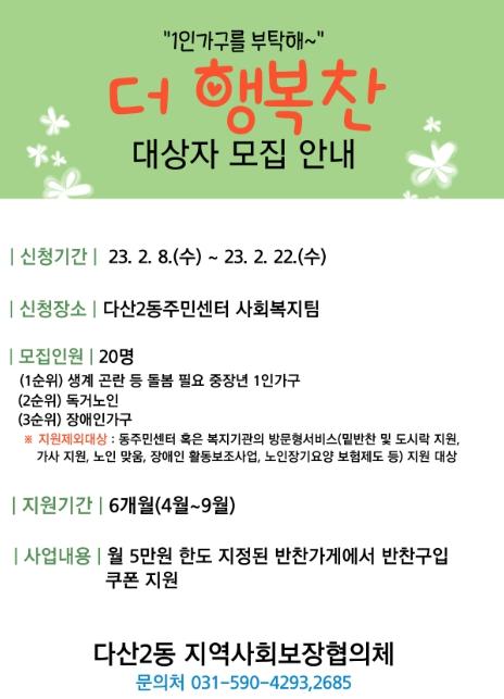 지원 대상은 돌봄이 필요한 1인 가구 중 중장년 1인 가구, 독거노인, 장애인 가구를 우선순위로 연령, 건강 상태, 주거 환경, 소득 수준 등의 기준에 따라 선정되며, 식사 배달 등 유사 돌봄 서비스 수혜자는 제외된다. 선정된 대상자는 지정 반찬 가게에서 월 5만 원 한도로 반찬을 구매할 수 있다.