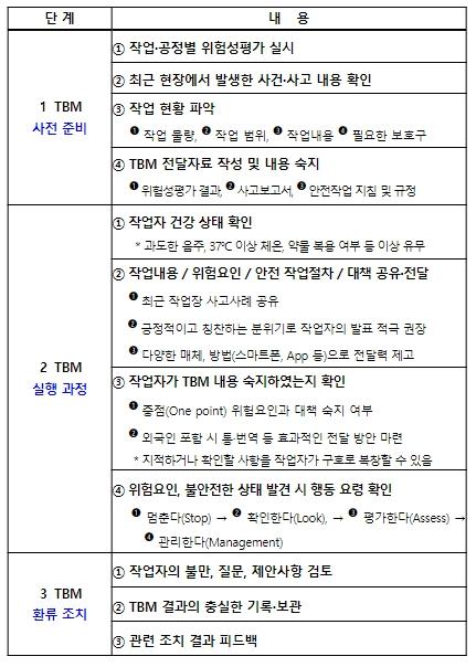 특히, 매일매일 작업방식이 바뀌거나 작업자가 바뀌는 현장의 경우 주기적인 작업 전 안전점검회의(TBM)는 작업자의 안전 확보에 핵심적인 역할을 한다.