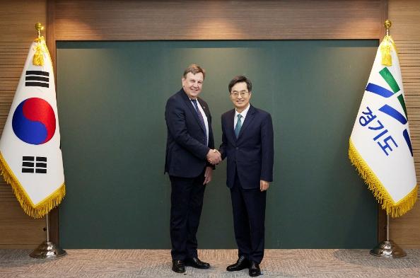[한국뉴스타임=편집국] 김동연 경기도지사가 존 위팅데일(John Whittingdale) 영국 무역특사를 만나 향후 경기도와 영국 간 RE100(재생에너지 100% 사용) 등 기후변화 대응과 미래 첨단산업 분야의 경제 협력 방안을 논의했다.