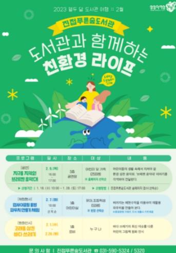 '열두 달 도서관 여행'은 시민들에게 다양한 문화생활을 제공하기 위해 남양주시 12개 공공도서관에서 매월 릴레이로 진행하고 있는 독서문화 프로그램으로, 지난 1월 평내도서관에 이어 2월에는 진접푸른숲도서관이 도서관 특화 주제인 ‘친환경’을 살려 '도서관과 함께하는 친환경 라이프'를 테마로 프로그램을 운영한다.