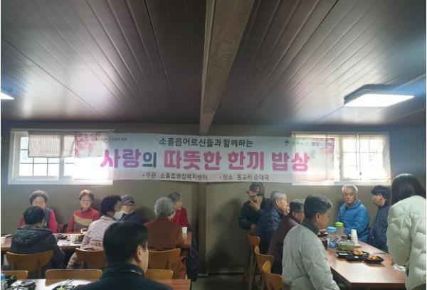 강효진 소흘읍장은 “바쁜 영업시간에도 기꺼이 어르신들을 위한 따뜻한 식사를 제공해 주셔서 깊이 감사드린다.”며, “나눔 활동이 우리 지역 곳곳에 퍼져 더 살기 좋은 소흘읍이 되도록 노력하겠다.”고 말했다.