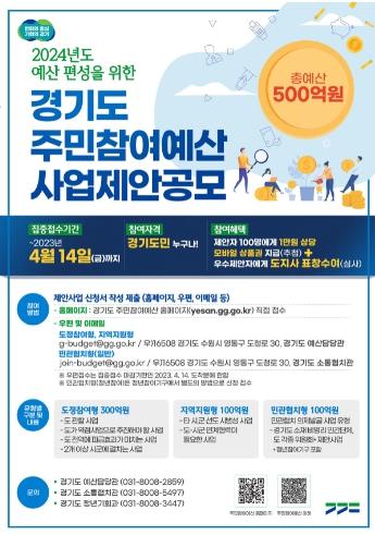[한국뉴스타임=편집국] 경기도가 주민참여예산제의 하나로 2024년 예산 반영을 위한 주민 제안사업을 오는 4월 14일까지 집중 접수한다.