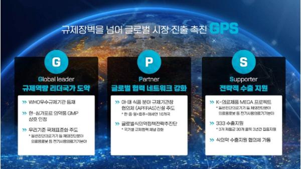 식약처는 국내 우수 제품이 세계로 뻗어나갈 수 있도록 글로벌 시장으로 진출하는 길을 여는 수출 GPS 전략을 추진하고 있다.