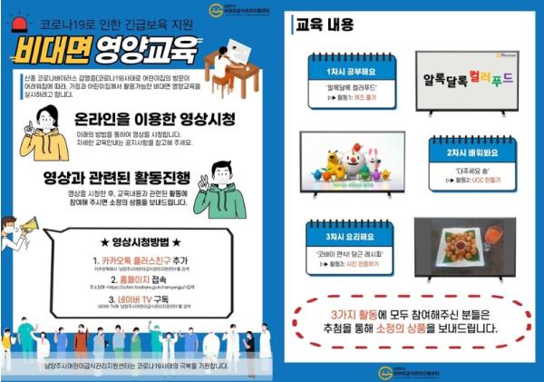 [KNT한국뉴스타임] 남양주시 어린이급식관리지원센터(센터장 김미정)는 지난 8일 네이버TV에 채널을 개설하여 코로나19로 방문교육에 어려움을 겪고 있는 어린이집 및 관내 가정을 대상으로 누구나 쉽게 참여할 수 있는 어린이교육 관련 영상을 게시했다고 밝혔다.