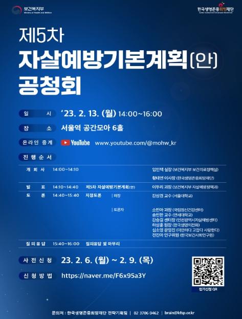 이날 공청회에서는 보건복지부 이두리 자살예방정책과장의 제5차 자살예방기본계획(’23~’27)(안) 발표를 시작으로,