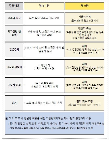 이번 방안은 2023년 새 학기를 맞아, 학생ㆍ학부모와 학교 현장의 방역부담을 줄이면서, 교육활동 정상화 등 온전한 일상 회복에 더 가까이 갈 수 있도록 학교 방역체계를 보완했다.