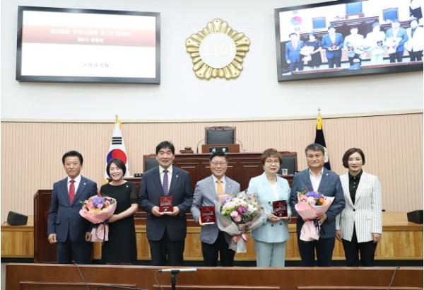 한편, 이날 본회의 개회 전 본회의장에서는 제8대 구리시의회 전반기 의장단인 박석윤 의장, 김형수 부의장, 임연옥 운영위원장 등 3명에게 구리시의회 발전에 기여한 공로로 공로패를 전달했다.