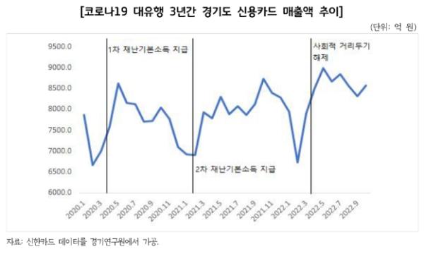 경기연구원은 2020년 1월 1일부터 2022년 10월 31일까지 경기도 소재 신용카드 오프라인 가맹점의 일자별 매출액 추정치 자료를 활용해 코로나19 대유행이 3년간 코로나19 확산으로 영향받은 경기도 소상공인들의 매출 변동을 종합적으로 점검한 ‘코로나19 대유행 3년, 경기도 신용카드 매출 동향과 시사점’ 보고서를 발간했다고 14일 밝혔다.