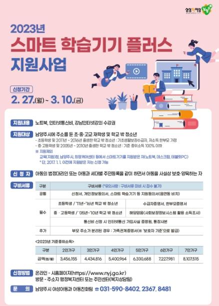 [한국뉴스타임=편집국] 남양주시는 저소득 가구 아동의 교육격차 및 디지털 사각지대 해소를 위해 학습용 스마트 기기를 지원하는‘2023년 스마트 학습기기 플러스 지원사업’을 실시한다고 14일 밝혔다.