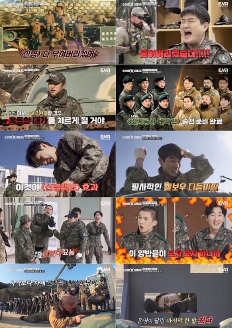 그런가 하면 이날 '신병부대'와 '가짜사나이'는 너나 할 것 없이 군대 게임에 진심인 모습으로 웃음을 자아냈다. 드라마 '신병' 속 무기력의 아이콘 '성윤모' 김현규가 군복을 입고 비지땀을 흘리는 희귀 장면을 보여주는가 하면, 최강군인 UDT 출신이 즐비한 '가짜사나이' 팀이 절대적 약체 '신병즈'를 기어코 이기려 온몸을 내던진 것.