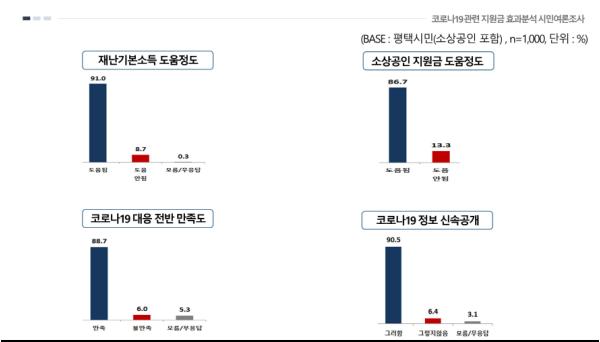 설문조사 결과 재난기본소득이 도움이 된다는 답변은 ▲매우 도움된다 (43.6%) ▲어느 정도 도움된다(47.4%) 등 91%가 도움이 된다고 응답했다. 재난기본소득의 주 사용처는 ‘생활용품 구매’가 78.5%로 높게 나타났다.