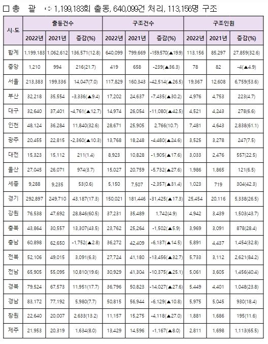 전년도(2021년)에 비해 구조출동은 12.8%(1,199,183회) 늘었고, 구조인원도 32.6%(113,156명) 증가한 것으로 나타났다.