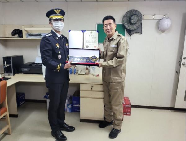 성대훈 포항해양경찰서장은 포항 신항에 입항해 있는 광양프론티어호에서 김종욱 해양경찰청장을 대신해 감사장과 인명구조 유공 동판을 전달했다.