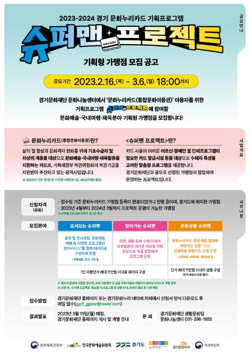 경기문화재단(대표이사 유인택) 문화나눔센터가 2023-2024년 경기지역 문화누리카드 기획프로그램 '슈퍼맨 프로젝트'에 참여할 기획형 가맹점을 모집한다.