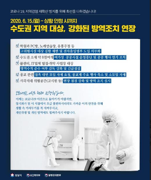 은수미 성남시장은 “지역사회 내 집단감염 확산 방지를 위해 보다 강화된 방역 및 점검활동에 총력을 다하겠다”며, “시민여러분께서도 밀폐된 공간에서의 모임 등을 자제하고, 개인 위생 수칙 준수에도 힘써 주시기를 바란다”고 당부했다.