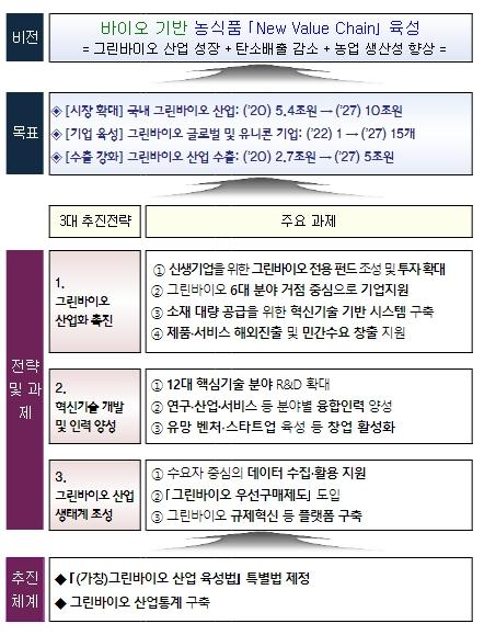 이에 농식품부는 ①산업화 촉진, ②혁신기술 개발, 인력양성 및 ③산업생태계 조성을 중심으로 ’27년까지 국내 산업규모 10조 원, 수출 5조 원, 세계적·거대 신생 기업(유니콘 기업) 15개 육성을 목표로 하는 ‘그린바이오 산업 육성 전략’을 수립하여 추진한다.