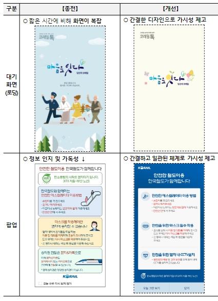 코레일톡의 주요 개선사항으로는 우선 앱을 실행하면 처음 접하게 되는 대기화면과 알림창(팝업)을 국민이 쉽게 이해할 수 있도록 간결하게 바꾸어 시인성을 높이고, 사용자에게 꼭 필요한 내용은 빠르게 파악할 수 있도록 알림창의 내용을 체계적으로 변경했다.