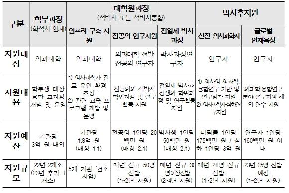 정부는 2019년 전공의 대상 시범사업에서 시작하여, 2020년 전일제 박사학위 과정, 2022년 의과학자 학부과정을 추가 지원하며 전주기 양성체계를 통해 본격적인 의사과학자 양성을 추진하고 있으며, 의과대학 졸업자의 99% 이상이 임상 진로를 택하던 이전과 달리, 정부 지원 후에는 매년 3~4%(110명 내외)가 의사과학자 진로에 신규로 진입하는 성과를 보이고 있다.