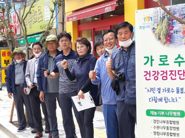 지난 10일 진행된 가로수 건강검진에는 수원시 공원녹지사업소 직원, 가로수 건강검진단 관계자, 김미경 수원시의회 교통건설체육위원장 등 10여 명이 참여했다.