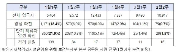 중국 코로나19 상황은 정점을 지나 안정화 단계로 이행한 것으로 판단되고, 입국자 검사 양성율도 1월 첫 주 18.4%(단기체류자 21.9%)에서 2월 2주 0.7%(단기체류자 1.5%)로 지속 감소중이다.