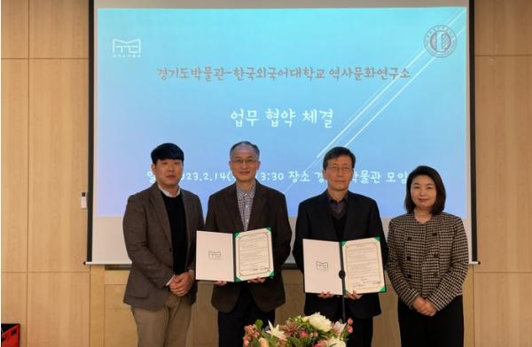 [한국뉴스타임=편집국] 경기문화재단 경기도박물관(관장 김기섭)과 한국외국어대학교 역사문화연구소는 2월 14일 오후 경기도박물관 소회의실에서 ‘경기도박물관-한국외국어대학교 역사문화 지식 공유 및 대중성 강화’를 위하여 상호협력 업무협약(MOU)을 체결했다.