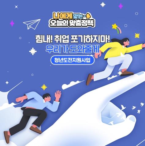 2021년부터 시작한 청년도전지원사업은 준비 기간이 길어지면서 구직을 포기한 청년들에게 건강검진부터 성격검사, 진로 컨설팅, 직업체험 등 서비스를 제공해 취직 욕구를 고취하는 프로그램입니다.?청년들의 경제활동 참여 및 노동시장 복귀를 지원하는 사업으로 자치단체의 청년센터를 통해 지원 받을 수 있어요.