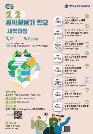 [한국뉴스타임=편집국] 경기도공익활동지원센터는 공익활동가 양성과 신규활동가의 역량 강화를 위한 ‘2023 공익활동가학교-새싹 과정’의 참여자를 모집한다.