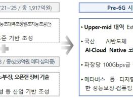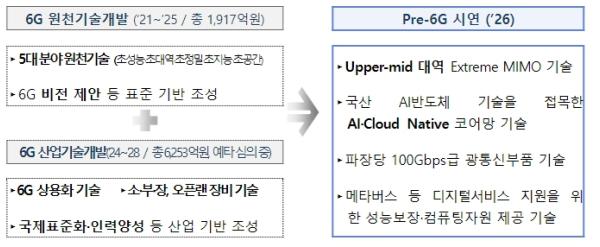 과기정통부는 그동안 원천기술 중심으로 추진해왔던 6G 연구개발에 더하여 상용화, 소·부·장 및 오픈랜 기술개발을 병행 추진함으로써 글로벌 기술패권 경쟁에 본격적으로 참여한다는 계획이다. 과기정통부는 이를 위해 6,253억원 규모의 R&D 예비타당성조사 절차를 진행하고 있다.