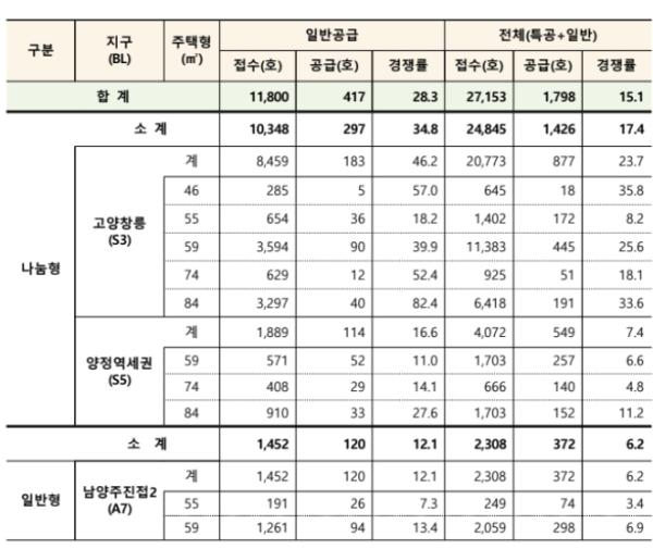 일반공급 유형별 경쟁률은 나눔형이 34.8대 1, 일반형 12.1대 1로 특별공급에서와 마찬가지로 나눔형이 높게 나타났으며, 지역별 경쟁률은고양창릉이 46.2대 1로 양정역세권(16.6:1)과 남양주진접2(12.1:1)보다 높게 나타났다.