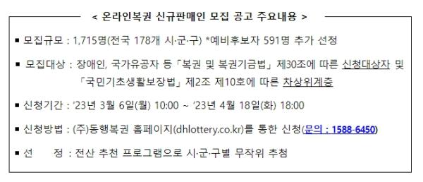 이번 공고는 온라인복권 판매점 부족으로 인한 국민불편 해소와 취약계층의 경제적 자립지원 등을 위해 복권판매점을 단계적으로 확충하기로 한 복권위원회 의결(2022.02.25.)에 따른 후속사항이다.