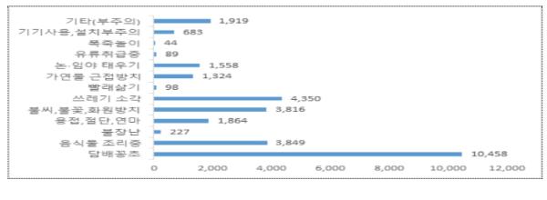 화재 원인은 부주의(55.6%)'전기적요인(22.2%)'기계적요인(9.1%) 순이었으며, 담배꽁초와 쓰레기 소각 등 부주의로 인한 화재가 30,279건(55.6%)으로 절반 이상인 것으로 나타났다.