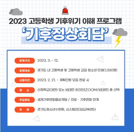 [한국뉴스타임=편집국] 경기도청소년수련원이 기후 위기 문제를 토론하고 해결방안을 모색하는 환경교육 프로그램 ‘기후 정상회담’에 참가할 고등학생 단체를 21일부터 모집한다.