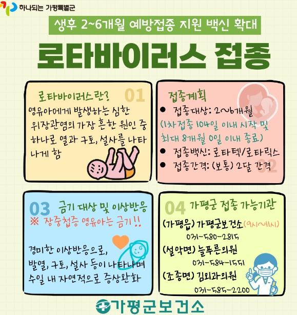 [한국뉴스타임=편집국] 가평군이 영아를 대상으로 진행하고 있는 로타바이러스 무료 예방접종을 다음달 6일부터 위탁의료기관으로 확대 실시한다고 21일 밝혔다.