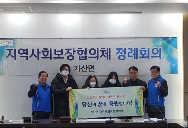 이번 희망 지원 사업 대상은 가산면에 거주하는 취약계층 가구 고등학교 졸업자 3명으로, 경제적 부담을 덜어주기 위해 대학에 진학하는 학생에게는 장학금을, 취업을 준비하는 사회 초년생에게는 구직비 70만원 씩을 지원했다.